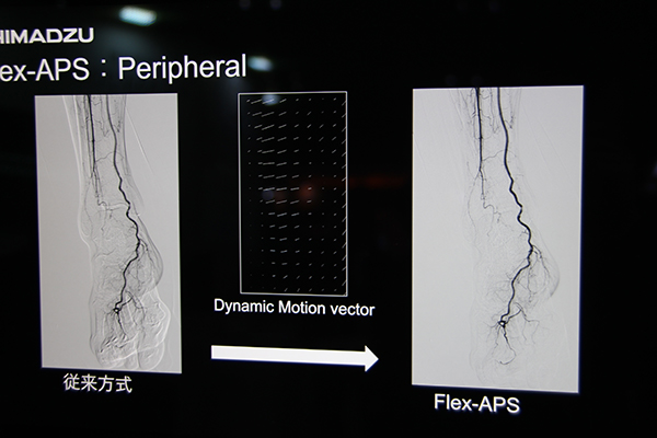 また,高齢化に伴い増加傾向にあるPAD(Peripheral Arterial Disease:末梢動脈疾患)の診断に有用な機能として“SCORE Chase”をアピールした。従来,下肢造影画像は分割して撮影し,つなぎ合わせる必要があったが,SCORE Chaseでは造影の様子をリアルタイムに確認しながらテーブルを動かして連続的に画像を収集し,撮影終了後に自動で長尺画像が生成される。造影,撮影が1回ですむため,従来と比べ造影剤量・被ばく線量を低減することができ,低侵襲な検査を提供する。