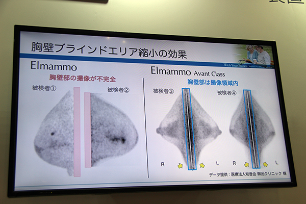 2017年9月に国内販売を開始した乳房専用PET装置「Elmammo Avant Class」は,前機種「Elmammo」からベッドの改良や検出器の最適化を図った。Elmammoは被検者がベッドに腹臥位となり検出器ホールに乳房を片方ずつ入れることで,乳房PET検査を行える専用装置。多くの臨床画像を提示し,全身用PET/CT装置では検出が困難な非常に小さな乳がんの描出や,化学療法前後の評価など,高い精度で検査できることを示した。乳房を圧迫するなどの負担もなく,被検者に優しい検査を提供する。