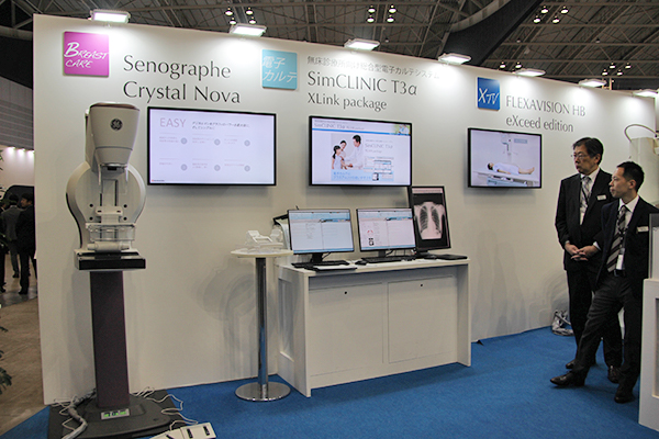 クリニック向けの製品を紹介するコーナーでは,X線テレビシステム 「FLEXAVISION HB package eXceed edition」や電子カルテシステム 「SimCLINIC T3α XLink package」,デジタルマンモグラフィ「Senographe Crystal Nova」(GE社製)を展示した。