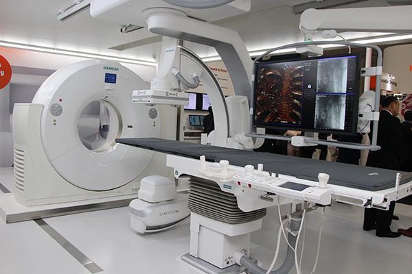 Image-Guided Therapyの新コンセプトとしてITEM直前に発表された「nexaris Therapy Suites」は,CT,MRI,血管撮影装置,X線透視・撮影装置を組み合わせ,一つのモダリティのように運用することで,治療の安全性や精度,効率を上げ,患者や術者の負担を軽減することを目的としている。会場では,IVR-CTシステム「nexaris Angio-CT」の実機を展示。血管撮影装置とCTのスムーズな切り替えや,CT画像とアンギオ画像の自動重ね合わせといった利点をアピールした。