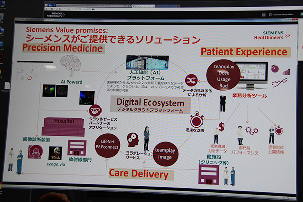 ヘルスケアITとしては,クラウドサービス「teamplay」を拡大させたデジタルクラウドプラットフォーム「Digital Ecosystem」を紹介した。teamplayでは現在,線量情報管理や利用状況分析,プロトコール管理などの機能を提供しているが,これら機能はDigital Ecosystemではその一部となり,将来的にはAI技術の利用やサードパーティのアプリケーションなどをDigital Ecosystemに乗せ,ユーザーが活用できることをめざしている。