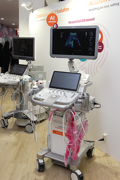 超音波診断装置は,新製品「ACUSON Juniper」をメインに展示した。コンパクトさと汎用性が特長の装置で,設置面積をハイエンドモデル「ACUSON S2000」の約60%に抑えながら,高画質にこだわって開発されている。5つのプローブポートや,スタンバイ状態から5秒で検査が可能な機動性により,院内のさまざまな場所で活用できる。画質は,日本のユーザーの評価を得ながら作り込まれており,診断に有用な画像を提供する。