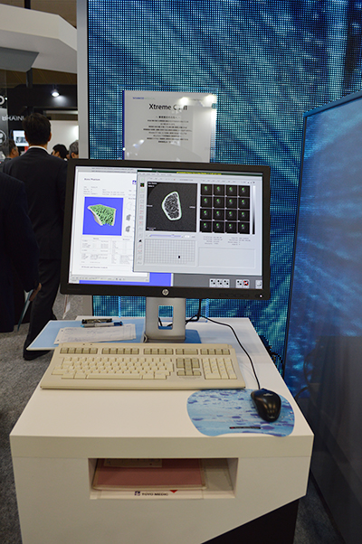 スイスSCANCO MEDICAL社のXtreme CT IIは,ヒト生体に使用可能な四肢用CTとして世界最高解像度の60μmを実現したX線マイクロCTスキャナ。外観が新しくなったことを受けて,実寸大モデルとワークステーションが用意された。骨密度に加え微細構造の解析として,皮質骨および海綿骨の骨塩量,骨梁幅,骨梁数,皮質骨多孔性などの多彩なパラメータの解析が可能である。最大スキャンサイズは140mm×200mmで,被ばく線量は胸部X線撮影の1/10程度である5μSv以下という低被ばくを実現している。1cm厚を約2分で撮影し,146枚の画像を得られる。