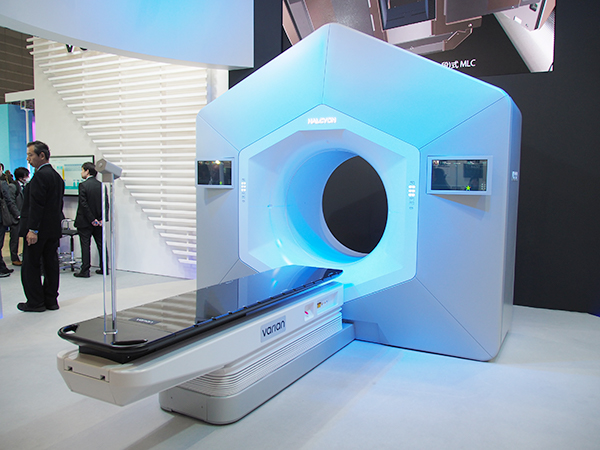 IGRT,IMRTに特化した放射線治療装置の新製品「Halcyon」の実機モデルをブース中央に展示しアピール