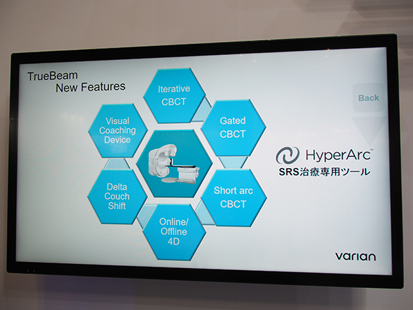 このほかブースでは,ブラッシュアップされた同社放射線治療装置のフラッグシップ機である「TrueBeam / TrueBeam STx」の新機能として多発脳腫瘍などのSRS(stereotactic radiosurgery)治療専用ツール“HyperArc”などのほか,薬機法承認を取得した放射線治療計画システム「Eclipse」の最新バージョン(Ver.15.5)や放射線治療情報システム「ARIA」などが紹介された。