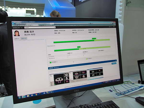 ARIAは,治療データ照合ソフトウエアから患者情報,照射カルテ,使用画像,発生画像,照射実績など放射線治療に関する情報の一元管理を可能とするシステム。これらの情報はすべて,1つのモニタ上で参照・入力可能で,放射線治療の正確,安全,効率的な運用を支援し,治療実績のデータの二次利用なども容易に可能となる。このため,米国では日本における治療RISの役割も含んで使用されている。今回のITEMでは,日本向けの対応が強化されたVer.15が紹介された。上位システムである電子カルテやオーダリングシステムとの接続を直接行えるため,より多くの情報を相互にやり取りすることが可能であり,従来はローマ字表記のみであった患者名の情報を,漢字とカナの双方を取得して表示できるようになった。また,Webベースのアプリケーションである“放射線治療ポータル”を搭載し,治療時の様子や全身症状,放射線障害などの情報を写真や文字情報で容易に共有することができる。これにより,放射線治療部と病棟の看護師や依頼医とのコミュニケーションの強化が図れる。治療オーダはカレンダーで表示され,キャンセルなどの情報も一目で確認可能であり,治療の進捗状況は数値のみの表だけでなく,グラフィック表示が追加され,視覚的にわかりやすくなっている。さらに,がんの病期分類は,以前は米国の基準であるAJCCを採用していたが,現在は日本での基準であるUICCが実装されている。