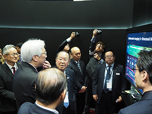 瀧口社長から説明を聞くキヤノンの御手洗冨士夫代表取締役会長CEO