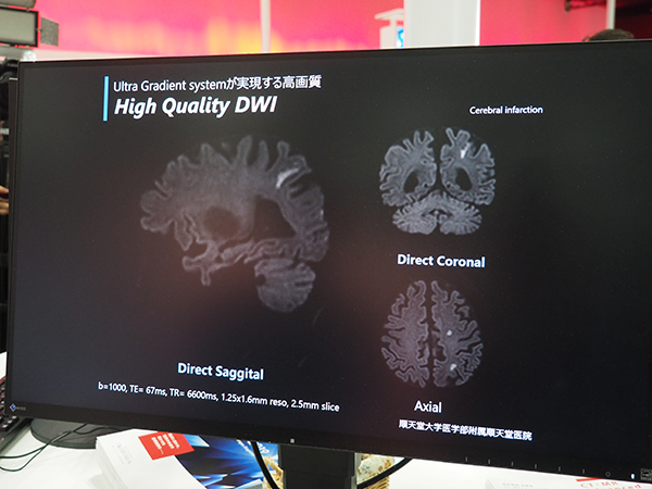 MRでは,1.5T MRI「Vantage Orian」がモック展示され,“MRシアター”を体験できるセットアップで来場者にアピールした。MRシアターは1.5T,3Tのワイドボア装置で利用できる。また,研究機として国内では5台が稼働中の3T MRI「Galan ZGO」について,ユーザーコメントの映像と,ディープラーニングを用いた画像再構成技術“DLR(W.I.P.)”とあわせた最新の臨床画像をディスプレイで紹介した。そのほか,Ultra Gradientシステムによる“High Quality DWI”,“Fast 3D”,“ForeSee View”などの最新のアプリケーションや機能を紹介した。