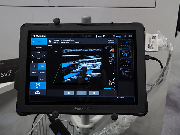 超音波画像診断装置(UL)では,フラッグシップの「Aplio i800」とハイエンドの「Aplio a550」を展示。Aplio i800では,CTやMR画像とのフュージョンによる“Smart Fusion”によって穿刺などをサポートできることをPRした。また,キヤノンメディカルシステムズの超・超高周波プローブである33MHz高周波リニアプローブ(PLI-3003BX)による血流や静脈弁などの高精細画像をアピールした。そのほか,2018年に登場したタブレット超音波「Viamo sv7」がITEMでは初出展された。12インチのモニタで1回の充電で3時間使用することができる。病院内での持ち運びや在宅や訪問診療,スポーツ診療での利用が期待される。
