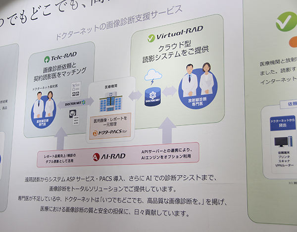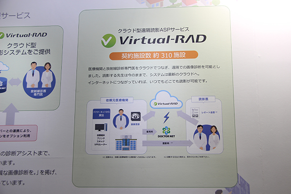 主力の遠隔読影サービス「Tele-RAD」「Virtual-RAD」に加え,次世代の新サービスや画像診断をアシストする人工知能エンジンプラットフォーム「AI-RAD」を,デモ画面を交えて紹介