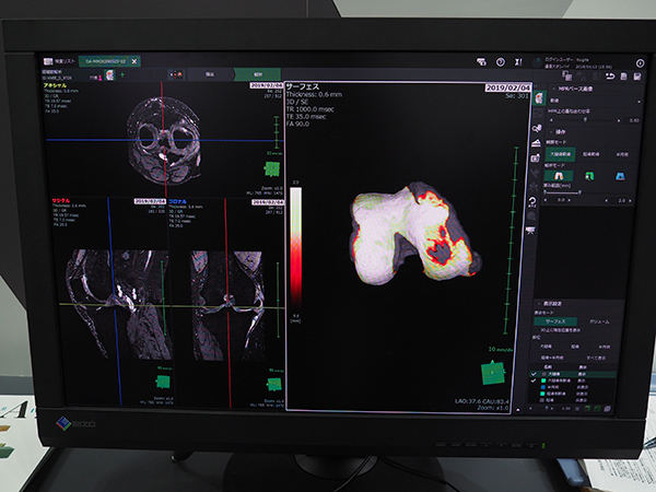 そのほか,「SYNAPSE VINCENT」のバージョン5.4に搭載された“膝関節解析”,“ボーンビューア”などの機能を紹介した。すでに技術としては発表済みの機能だが薬機法認証を経て製品に搭載されることをアピールした。膝関節解析は,MRIのプロトンとT2*の画像を用いて膝軟骨と半月板の自動抽出,定量解析を可能にする。