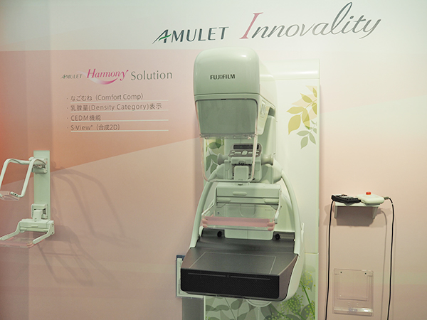 マンモグラフィのコーナーでは,デジタル式乳房用X線診断装置「AMULET Innovality」と,マンモグラフィ検査を受けやすい環境や機能を提供するため“AMULET Harmony Solution”として展開しているオプションの中から,“なごむね(Comfort Comp)”“乳腺量(Density Category)表示”“CEDM機能”“S-view(合成2D)”を中心に紹介した。