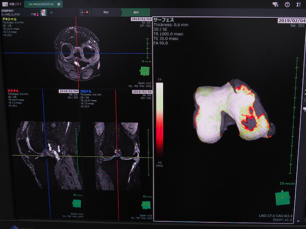 膝関節解析では,MRIの特定撮影条件からディープラーニング技術を活用して部位の自動認識や軟骨,半月板の厚みの定量解析が可能になった。MRIのデータを読み込むと,大腿骨,脛骨,軟骨(大腿骨側,脛骨側),半月板を自動認識して抽出する。軟骨の厚みマップは薄くなっている部分を赤く表示する。欠損領域については,保険適用の条件の一つである欠損領域4cm2を画像上で簡単に計測することができる。