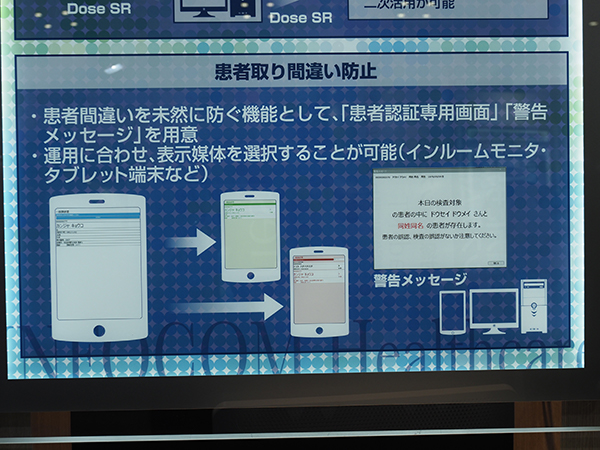 RISの「iRad-RS」に今後搭載される予定の患者認証機能を用いた患者取り間違い防止ソリューションがPRされた。