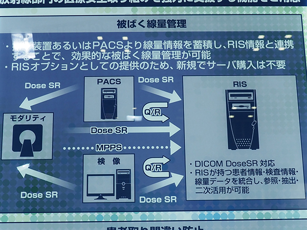 「iRad-RS」は,オプションで提供される被ばく線量管理機能もセールスポイントである。前回のITEMで発表された被ばく線量管理機能は,DICOM RDSRをPACSに保管された画像データやモダリティから収集して,RISで管理している患者情報,検査情報などと連携して,被ばく線量を管理する。Excelなどで統計・分析を行うためにファイル出力や印刷機能も搭載しており,DRLs 2015に基づいた撮影プロトコールの設定に役立てることができるなど,被ばく線量の最適化に貢献する。