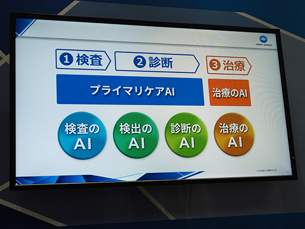 ブースでは“未来につなぐ”技術として,開発を進めている人工知能(AI)のプレゼンテーションも行われた。コニカミノルタでは,丸紅と米国Enliticと協業し,プライマリケアAIとして,検査・検出・診断における画像処理や病変検出の開発を進めている。また,治療分野においても買収した米国Ambry Genetics,Invicroの技術によるAI開発を行っていくという。プレゼンテーションでは,熊本大学と進めている乳がん,脳腫瘍,アルツハイマー病のradiomicsおよびCAD研究についても紹介された。