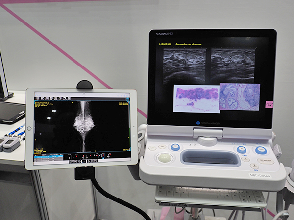 乳がん検診ワークフロー「CADnavi」では,「FINO.View.air」で画像を参照しながら超音波診断装置「SONIMAGE HS1」での検査を提案