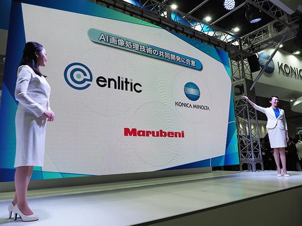 JRC 2019では,全体を通じてAIが大きな話題となった。ITEM会場でも各社がAIに関する発表などを行ったが,コニカミノルタジャパンのブースでも“未来をつなぐ”をテーマにしたプレゼンテーションでAIの開発をアピールした。ITEMに先立つ4月10日には,医用画像向けAIの開発を行っている米国Enliticと丸紅との間で,胸部単純X線画像から病変などを検出するAI技術について,共同開発契約を締結したことを発表した。Enliticは2014年に創業したばかりの企業であるが,ディープラーニングを用いた医用画像解析技術ではトップクラスの実績を有している。RSNAでもCT画像などから肺結節を検出するアルゴリズムの発表・展示を行っており,放射線医学の分野で存在感を示している。また,丸紅は,2017年にEnliticを日本でのビジネス展開に関する業務提携を結び,2019年1月にはEnliticへの出資を発表した。一方のコニカミノルタも胸部単純X線画像における“Bone Suppression処理”や“Temporal Subtraction処理”いった画像処理技術を有している。3社が提携することで,日本国内向けのAIアルゴリズムの早期展開が期待される。プレゼンテーションでは,高速で画像解析を行うEnliticの技術力を示すデモンストレーションを行い,その高い性能をアピールした。