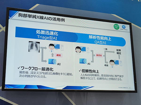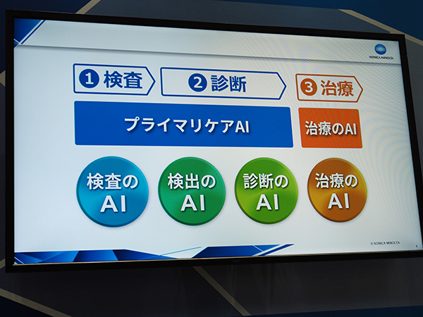 今回の発表のとおり,医療分野でのAI開発を加速するコニカミノルタであるが,特に「プライマリケアAI」の開発に力を入れていくという。ブース内では,プライマリケアAIとして,検査・診断における「検査のAI」「検出のAI」「診断のAI」について説明を行った。その一例として,ディープラーニングによる単純X線画像のノイズ抑制や,画像解析により異常を検出して医師に知らせるトリアージ型AIによるワークフローの最適化,また人による解析とAIの画像解析を並行し両者の結果を突合して解析結果の信頼性を向上させるといったケースを示した。また,プライマリケアだけでなく,治療においてもAIの開発を進めていくという。熊本大学との間で進めている乳がん,脳腫瘍,アルツハイマー型認知症の診断・治療に関するradiomicsの共同研究を紹介した。