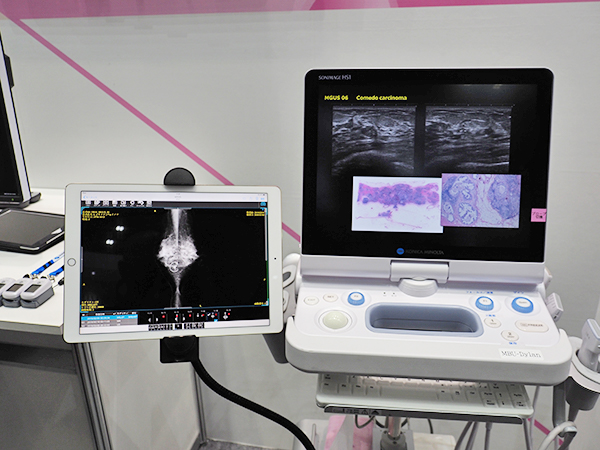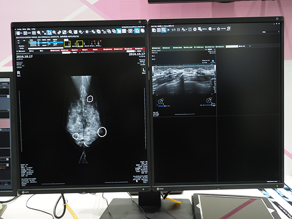 プレゼンテーションステージでは,“人をつなぐ”技術としてマンモグラフィ・乳房超音波併用検診を効率化するソリューション「CADnavi」が紹介され,ブース内の女性医療のコーナーではそのデモンストレーションも行われた。「乳がん検診における超音波検査の有効性を検証するための比較試験(J-START)」の研究報告を受けて,マンモグラフィ・乳房超音波併用検診が注目されているが,超音波検診では検査者による結果のバラツキなどが問題となっている。