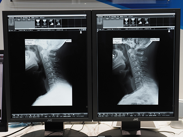 このAeroDR fineの画像処理エンジンがREALISM tuneである。AeroDR fineの高解像度というメリットを生かすための技術であり,コンソール「CS-7」に搭載される。微小構造を高い鮮鋭度で描出するために,周波数強調処理を改良。さらに,被検者の体格に応じてダイナミックレンジ圧縮強度を自動でチューニングして最適化を図る。被写体に影響されることなく高画質が得られるだけでなく,検査者による画像調整時間をなくし,時間短縮や業務効率の向上にも寄与する。今回のITEMでは,新たに腹部正面,腹部正面ポータブル,骨盤,肩関節,大腿骨,全下肢の検査に適用が拡大したことがアナウンスされた。