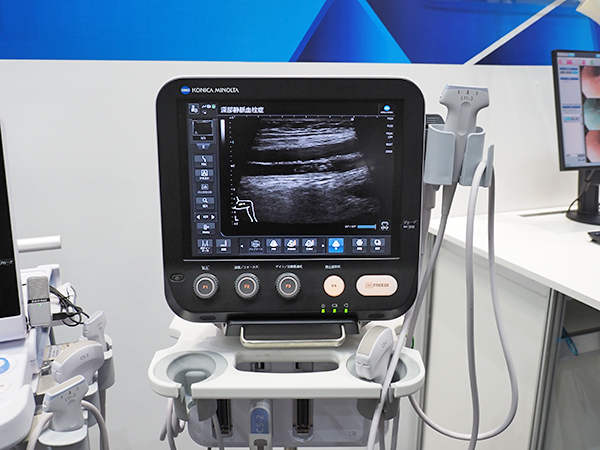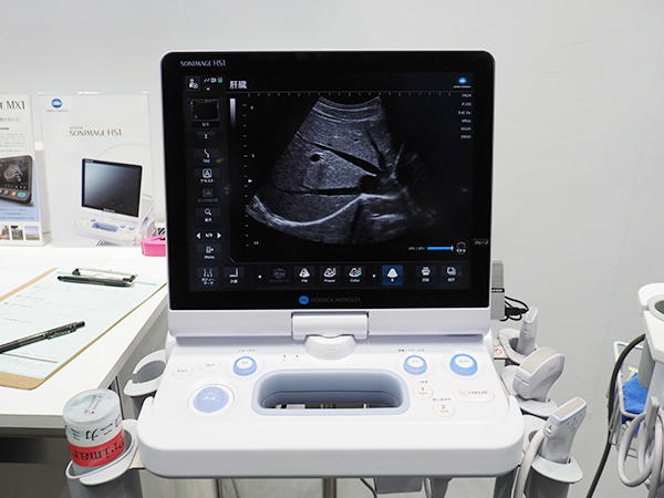 超音波診断装置のコーナーでは,「SONIMAGE HS1」と「SONIMAGE MX1」の2機種を展示して,デモンストレーションを行った。コニカミノルタは2014年にパナソニックヘルスケア(現・PHC)の超音波事業を統合し,本格的に超音波診断装置を手がけるようになった。X線撮影装置,ヘルスケアITとともに超音波診断装置を事業の3本柱として位置づけており,2015年にはフランスSuperSonic Imagineの「Aixplorer」の国内販売も開始。2017年には,シーメンスヘルスケアから産婦人科向け超音波画像診断装置の販売事業の譲渡受けるなど,事業を拡大している。2016年には,日本超音波医学会から,「超広帯域高感度リニアプローブの開発とTriad Tissue Harmonic Imaging (Triad-THI) による画像改善」に対して,第16回技術賞が送られるなど,技術力の高さは学会のお墨付きである。