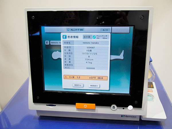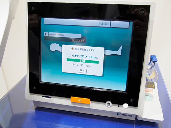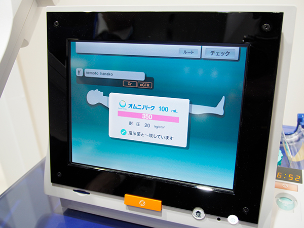 今回の展示では,CT用インジェクタ対応のCEエビデンスシステムの機能として,“指示薬連携”が紹介された。CEエビデンスシステムでは,RISとの連携により患者情報を取得することで,腎機能値や副作用履歴に加えて指示薬が表示される。インジェクタに造影剤シリンジをセットした際にシリンジのICタグを読み取ることで,造影剤が異なっている場合にはコンソールモニタ上にアラートが表示される。指示薬の取り違えの防止や正しい薬剤の記録が可能となり,また,患者情報の取得前にシリンジをセットすると情報の取得が促されるため,情報の取り忘れ防止にも役立つ。