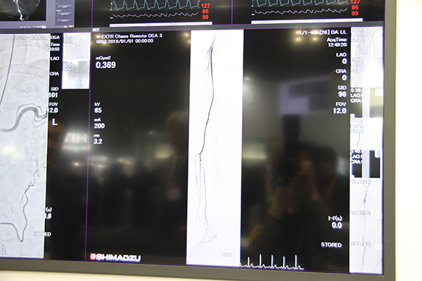 血管撮影システムTriniasシリーズからは,天井走行タイプで16インチ×12インチの大視野FPDを搭載した「Trinias C16 unity edition」が展示された。本装置は,頭部や腹部,四肢,心臓領域まで全身の検査・治療に対応するが,今回の展示の目玉となったのは,長尺DSAとロードマップ機能を融合させた“SCORE Chase”機能(オプション)である。従来,下肢長尺画像の作成は,分割して撮影した後,撮影した画像をつなぎ合わせる作業が必要であったが,SCORE Chase機能により,電動でテーブルを可変速しながら移動させて先端まで撮影し,撮影後に自動で長尺画像を生成することが可能になった。一度の撮影で作成できるため,造影剤の注入が1回ですみ,造影剤量を約35%,被ばく線量を約20%低減することを実現した。多機能カテーテルテーブル「SMART table」との組み合わせで,撮影時のテーブルの動きが記憶されるため,造影前後を位置ずれなく撮影でき,精度の高い長尺DSAが可能になる。
