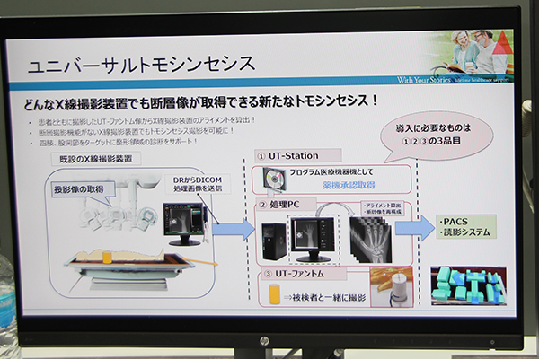 さらに,既存の一般X線撮影装置でトモシンセシス撮影を可能にする“ユニバーサルトモシンセシス”(W.I.P.)を紹介した。これは,専用ファントムとともに患部を角度を変えて複数回撮影し,ファントム像からエックス線撮影装置のアライメントを算出,得られた画像を断層画像として再構成するもの。H/W(PC)とソフトウエアを追加するだけで,既存の一般X線撮影装置で撮影,再構成が可能な点が利点である。四肢や股関節などが対象で,撮影には1〜2分を要することから,固定具も開発中である。通常の検査では,微細な骨折などは見逃されることも多く,疼痛の長期化や他疾患の誘発につながる懸念が大きい。しかし,このようなアプリケーションの活用により,早期発見が可能になれば,健康寿命の延伸に貢献しうる。また,コニカミノルタ社と開発した動態イメージングも紹介した。これは,一般X線撮影装置で撮影した画像を動画にすることができ,慢性閉塞性肺疾患(COPD)などの呼吸器疾患の早期発見が期待される。