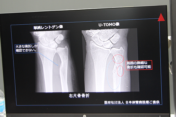 “ユニバーサルトモシンセシス”(W.I.P.)で取得した画像(右)。周囲の微細な骨折も確認できる。