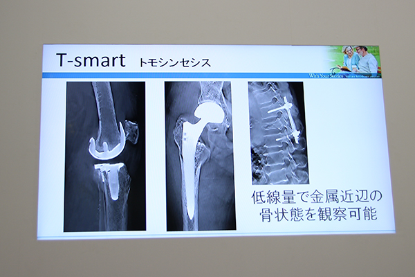 骨粗鬆症の罹患者数は約1300万人とも言われ,骨密度測定による早期発見が重要である。骨密度測定機能“Smart BMD”(オプション)は,DXA法による骨密度測定を短時間で精度良く行うことが可能である。さらに,骨密度測定の際に行う大腿骨のセグメンテーションを,人工知能(AI)のサポートで手間を簡略化する機能が,2019年夏に発売される予定である。一方,変形性関節症は,軟骨が摩耗し関節が変形する疾患で,罹患者数は約3000万人と推測される。人工関節置換術が行われるケースも多いが,金属製のため,術後のフォローアップが困難なことが課題となっている。SONIALVISION G4に搭載されている逐次近似法を用いた画像処理“T-smart”(オプション)では,トモシンセシスにより人工関節などの金属近辺の骨の状態を明瞭に描出できる。また,各検査での透視の低線量化では,新しいデジタル透視画像処理技術“SCORE PRO Advance”(W.I.P.)により,被ばく量を77%低減(自社比)しつつ,高画質が得られることも紹介された。
