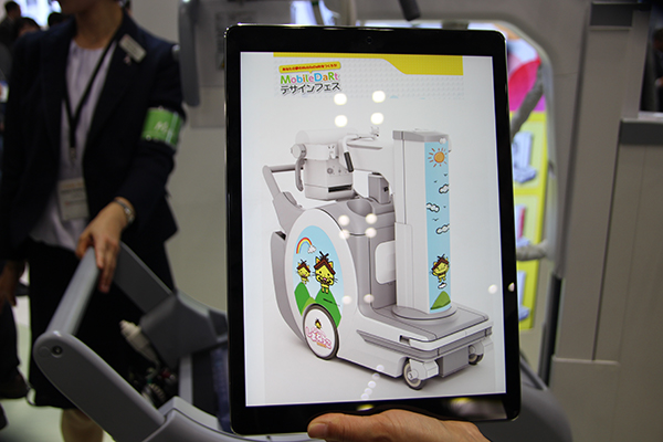 新発売のX線一般撮影システム「RADspeed Pro style edition EDGE package」が展示された。RADspeed Proシリーズの新ラインアップで,同シリーズの優れた操作性に加え,トモシンセシス,長尺撮影,デュアルエナジーサブトラクションなどの多彩なアプリケーションで,健康長寿に貢献する点がアピールされた。撮影部位に合わせてX線管保持部が上下方向に自動追従する上下運動機能や,リモコン操作で天井走行式X線管懸垂器が自在に移動し,あらかじめ登録した位置に自動設定されるオートポジショニング機能を搭載。夜間などの人手が少ない場合でも,一人で患者の位置合わせと撮影が容易に行える。ガイド内にケーブルを収納して天井レールと一体化するケーブルガイドによって,X線管保持部の移動がスムーズになり,スタイリッシュかつ整然とした検査環境を実現している。