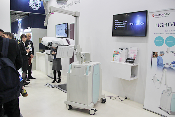 LIGHTVISIONは,ICG(インドシアニングリーン)を用いて直視下では確認できない組織表面下のリンパ管を可視化し,乳がん手術時のセンチネルリンパ生検を支援する装置。ICGの適応範囲が血管や組織の血流評価にも拡大され,臨床応用の広がりが期待される。ブースでは,リンパ浮腫に対するリンパ管静脈吻合術における応用が紹介された。乳がん手術時にリンパ節郭清を受けた患者のリンパ浮腫発症率は約10%と言われ,通常,弾力ストッキング着用などの対症療法が行われるが,近年注目されているリンパ管静脈吻合術により,QOL向上やリンパ浮腫の改善が期待できる。LIGHTVISIONはその治療支援に有用であり,島津では今後,普及に力を入れる考えだ。