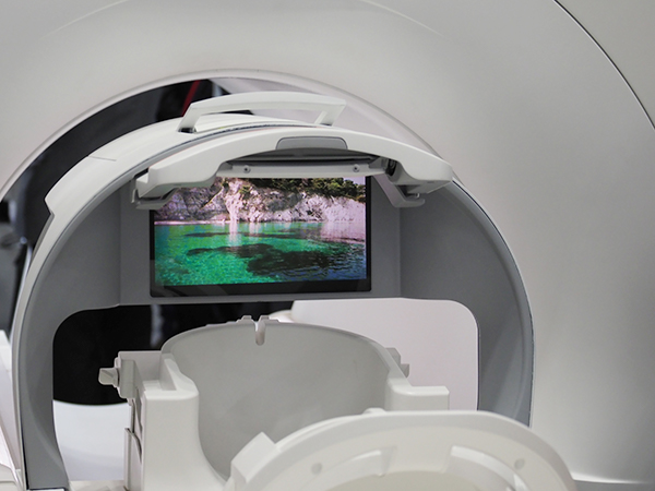 その中でも,特に力を入れてPRしていたのが,3月に発表したばかりの3T MRI「MAGNETOM Lumina」と1.5T MRI「MAGNETOM Altea」である。両機種ともにプレミアムクラスの研究用3T装置「MAGNETOM Vida」に搭載されている“BioMatrix Technology”を採用したハイエンドクラス装置。BioMatrix Technologyは,被検者の体格などの生理的特性に応じて最適な撮像を行うための技術の総称。ワンタッチでのポジショニングを可能にする“BioMatrix Select & Go”,寝台に内蔵されたセンサで呼吸同期を行う“BioMatrix Tuners”,被検者固有の局所磁場を補正する“Coilshim”,2D撮像においてスライスごとに最適なシミングを行う“SliceAdjust”などがある。さらに両機種は,高速撮像を行うためのアプリケーションパッケージ“Turbo Suite”も採用した。多断面同時励起・データ取得を行う“SMS(Simultaneous Multi-Slice)”や圧縮センシングなどのアプリケーションにより,従来比で頭部MRI検査を34%,膝関節MRI検査を50%短縮する。ブース内では,オプションとして,ガントリ内で被検者が映像と音声を視聴できる“Innovision”も展示した。