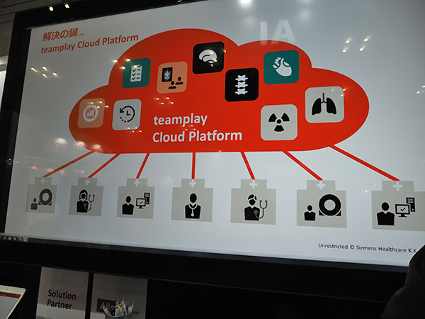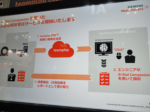 ヘルスケアITでは,医療クラウドサービス「teamplay」でAIのアルゴリズムや他社のアプリケーションを利用できるようになる「teamplay Cloud platform」が注目を浴びた。なかでも,大きなトピックなのが,胸部CT画像から心臓や肺,大血管の病変検出や計測などを行うAIアルゴリズム“AI-Rad Companion”を用いた「AI画像解析受託サービス」である。このサービスは胸部CT画像をteamplayを介して同社に送信すると,エンジニアがAI-Rad Companionを用いて解析して,その解析結果レポートをユーザーに返すというものである。6月をめどに期間限定のトライアルサービスとして提供する予定である。また,ヘルスケアIT関連では,医用画像解析ソリューション「syngo.via」のアプリケーションである“Cinematic VRT”のデモンストレーションも行われた。従来のVR画像よりも質感・陰影をリアルに再現し,診断はもとより術前シミュレーションや患者説明などにおいて有用な画像再構成技術である。このCinematic VRTは,同社のPACS「syngo.plaza 3D+」でも使用できる。このほか,遠隔撮影支援システム「syngo Virtual Cockpit」もPRした。このシステムは,モダリティ共有画面,チャットシステム,IPカメラで構成され,撮影業務を遠隔でサポートする。これにより,患者満足度の向上や人材不足解消,検査の標準化,教育,コストダウンを図ることができる。