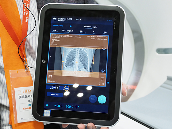 CTでは,前回のITEMで発表されたAIアルゴリズム搭載の「FAST 3D Camera」が新たにハイエンドクラスの「SOMATOM Drive」に対応したことを発表。実際の展示も行った。FAST 3D Cameraは,CT装置の天井に取り付ける。検査時には,FAST 3D Cameraで被検者の体格,位置などを読み取ることで,自動的にCT撮影部位が中心になるように寝台が移動。正確なポジショニングが可能になり,被ばく低減と検査時間の短縮が可能になる。また,CTは,タブレット操作が可能な「SOMATOM go.Top」も展示された。