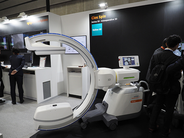 X線関連では,2018年に発表した血管撮影装置「Artis zee i BA Twin」を紹介した。会場内には,脳神経外科領域,腹部領域のインターベンションに対応したバイプレーンタイプの「Artis zee i BA Twin」を展示した。Artis zee i BA Twinは,16ビットの入出力に対応した“HDR(High Dynamic Range)フラットディテクタ”に対応。コントラスト分解能が向上し,高画質の3D画像を提供する。同じく2018年に発表した外科用X線撮影装置の「Cios Spin」も展示した。高精細な3D画像を撮影できるコーンビームCT技術“Retina 3D”を採用。アプリケーションとして,金属アーチファクトを低減する“MAR”,スクリューの自動検出を行う“Screw Scout”,2Dガイディング機能の“Target Pointer”を搭載している。