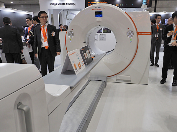 このほか,核医学装置では,PET/CTの「Biograph Vision」を展示した。SiPM半導体検出器を採用し,214psのtime-of-flight (TOF)時間分解能を実現。クリスタルのサイズを3.2mm×3.2mmにして空間分解能を向上している。