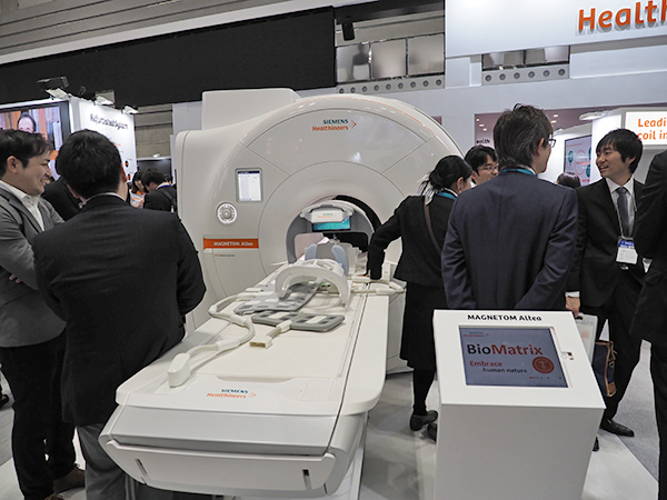 “We enable you to deliver high-value care.”をブースメッセージに掲げたシーメンスヘルスケアは,人工知能(AI)技術を用いた製品やサービスをはじめ,MRIなどのハードウエアにおいても新製品を展示。先進的な技術を来場者に披露した。ブースメッセージの“We enable you to deliver high-value care.”には,価値の高いケアを実現するための製品・サービスを提供していくという,同社の姿勢が示されている。同社では現在,「医療サービス向上の核となる4つの価値」として,「プレシジョン・メディシンの拡充」「医療サービス提供の変革」「ペイシェント・エクスペリエンスの向上」「医療デジタル化の推進」の4項目を掲げて,事業を推進している。価値の高いケアを患者に提供するため製品・サービスはもちろんのこと,医療機関の経営改善や医療従事者の働き方改革を支援するソリューションを手がけている。このような事業展開の一環として,大学や研究機関,医療機関とのパートナーシップを強化している。今回のITEMに先立つ2019年2月5日には,AIの共同研究などを柱としたパートナーシップを一般社団法人徳洲会と締結。また,2018年11月9日にも,社会医療法人渡邊高記念会との間で,地域医療の充実化に向けたパートナーシップの締結を発表している。