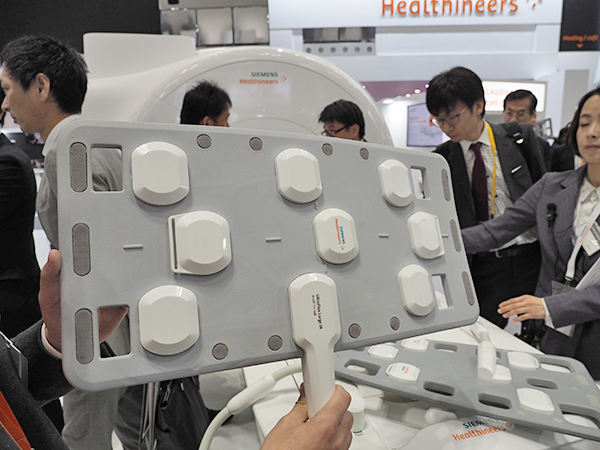 さらに,被検者がガントリ内で映像と音声を視聴できる「Innovision」が展示された。オプションとして提供される。バッテリ駆動で,クッションには骨伝導スピーカーを内蔵。被検者の不安を軽減できることから,小児検査の多い施設から期待が寄せられているという。このほか,医療機関の経済的な負担を軽減する汎用性の高いコイル「UltraFlex」も紹介された。肩や膝用のラージサイズ,手首や足首用のスモールサイズがラインアップされている18chのコイルである。