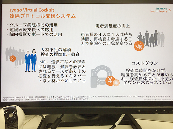 このほか,遠隔プロトコル支援システム「syngo Virtual Cockpit」も展示された。CTやMRI検査における装置の操作を遠隔で支援するもので,シーメンスの装置に対して使用できる。ユーザーインターフェイスは,チャット機能,モダリティ共有画面,IPカメラで構成され,画面を確認しながら,離れた場所にあるモダリティの操作を支援する。syngo Virtual Cockpitを導入することにより,人材不足の解消や検査の標準化が可能になり,スタッフの教育ツールにもなると期待される。