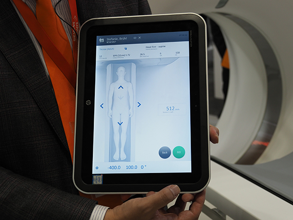 一方,SOMATOM go.Topは,前回のITEMで初披露されたモバイルワークフローCT。ガントリ前面に固定もできるタブレット型のコンソールを採用。このタブレットで,患者登録から撮影部位・プロトコールの設定,撮影後の画像確認まで,ほとんどの操作を行える。従来のCTのように検査室と操作室を行き来することなく,タブレットを持ちながら寝台横で被検者の顔を見ながら撮影業務を進めることができ,まさにJRC 2019のテーマにある「患者に寄り添って」検査ができるCTである。このほか,装置本体と造影剤のインジェクタを一体化していることもSOMATOM go.Topの特長である。