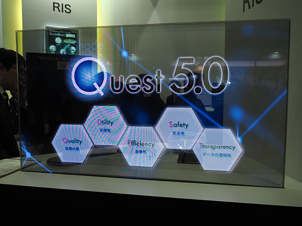横河医療ソリューションズは,展示テーマとして「(Shade)Quest5.0」を掲げて展示を構成した。QuestはQuality(医療の質),Utility(利便性),Efficiency(効率性),Safety(安全性),Transparency(データの透明性)の頭文字を取ったもので,それに政府が提唱する未来社会のコンセプトである“Society5.0”の超スマート社会を示す“5.0”を組み合わせたもの。Society5.0が示す未来像の中で,医療ITの領域において横河医療ソリューションズがどのように貢献できるかを含めて掲げられたテーマである。