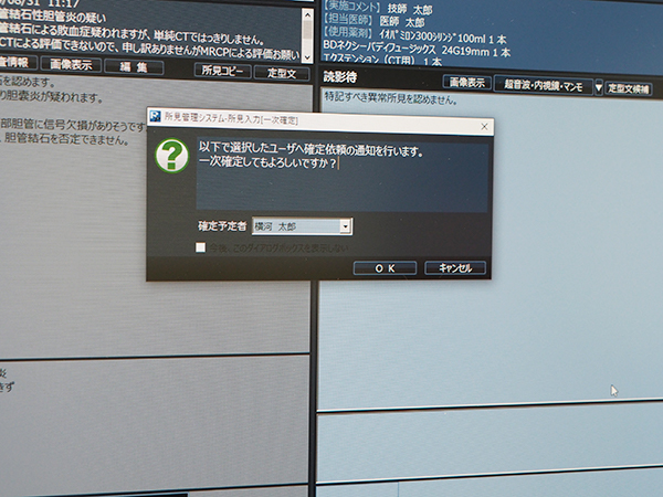 所見の確認依頼機能。レポートを入力して一次確定するとダイアログボックスから上級医を選択して依頼できる。