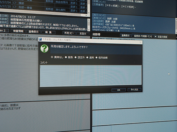 また,医療安全のためのシステムとして,レポートの確定時に重要度(緊急や他科依頼など)を付与することができる。コメントつけて所見を配信することが可能で,診療科医師への注意喚起や見逃しの防止などの効果が期待される。フラグの設定は病院ごとにカスタマイズできる。