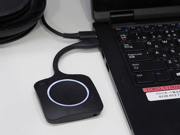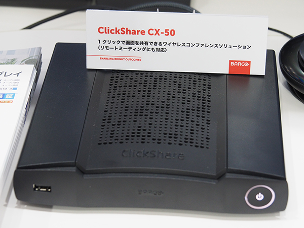 ワイヤレスプレゼンテーションシステム「ClickShare」をリモート会議向けに進化させた「ClickShare CX」シリーズも展示された。ITEM2019でも紹介されたClickShareは,PCに「ClickShareボタン」をUSB接続し,ベースユニットをつないだディスプレイに投影することが可能なシステムで,ワンクリックで画像切り替えが可能なことに加え,ケーブルレスな点がメリットである。今回紹介されたClickShare CXは,USB接続のカメラやマイクなどの周辺機器をベースユニットに統合してコントロールすることが可能になった。SkypeやZoomなどのソフトウエアに依存せずリモート会議などに活用でき,会議のスムーズな進行を助け,議論を活発にすることが可能なソリューションである。