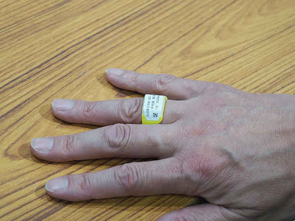 個人線量計「ガラスリング」。状況に応じて,上向きまたは下向きに装着する。