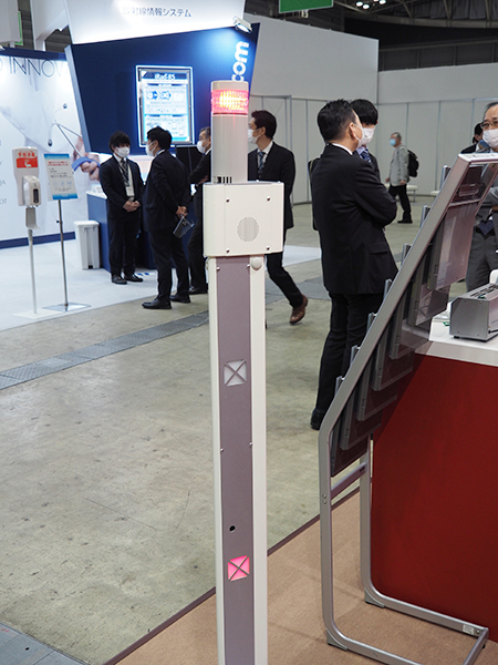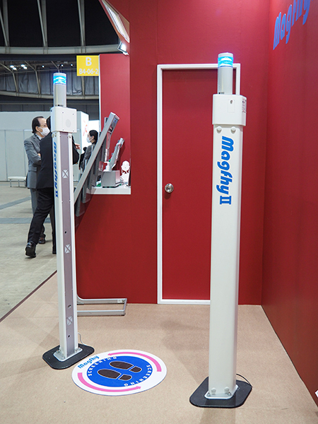 磁性体センサー「MagfhyⅡ」は,スリムデザインの2本のポールから成る。MRI室の入り口前に設置し,ポールの内部に設置されたセンサーが磁性体を検知すると,上部に設置されたランプと音声アナウンスにより注意を促すことにより,吸着事故を防ぐ。また,ポール付近で一回転することで,携帯している小さな磁性体の検知もできる。MagfhyⅡには,磁性体の移動方向や小さな磁性体を検知するベクトル検知能力(特許取得)や環境ノイズ抑制機能などが搭載され,誤警報を減らし,かつより確実な検知を行うことが可能となっている。