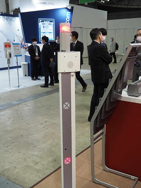 磁性体センサー「MagfhyⅡ」は,スリムデザインの2本のポールから成る。MRI室の入り口前に設置し,ポールの内部に設置されたセンサーが磁性体を検知すると,上部に設置されたランプと音声アナウンスで注意を促し,吸着事故を防ぐ。ポールの間の距離は1.5m程度まであけることが可能で,施設の運用に応じて感度を調整できる。