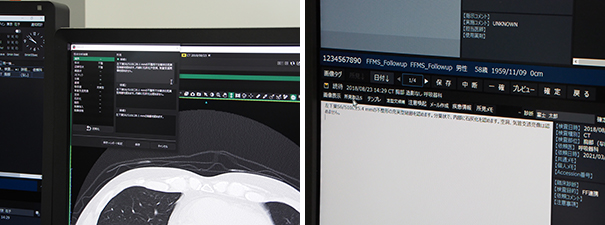 ReportではViewR上(右画面)に所見入力ウインドウを開いて画像から視線を動かさずに入力ができる。入力したテキストはReport(左画面)の所見欄にそのまま反映される。